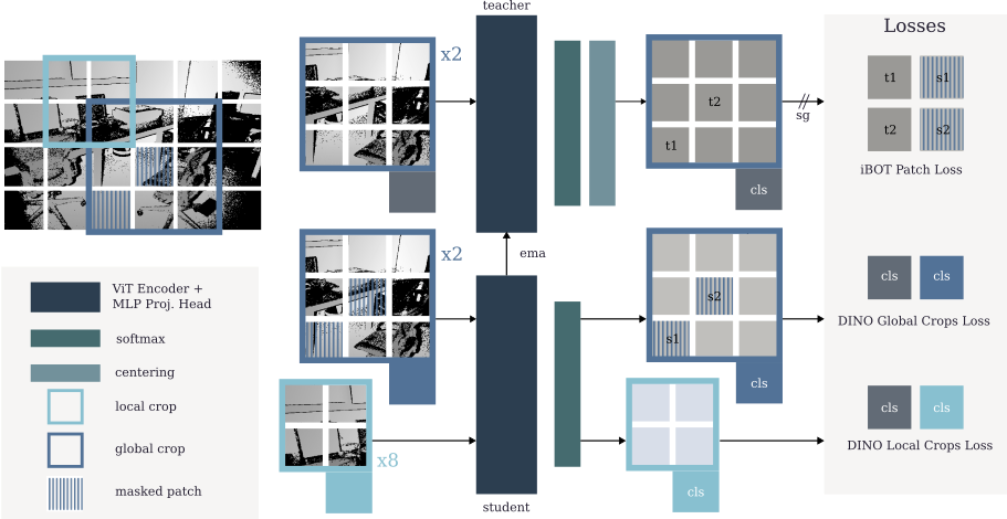 Self-Distillation Framework: DeFM uses a DINOv2-style self-distillation objective with global and local crops. The student network processes masked global crops and local crops, learning to match the teacher's representation through DINO losses and iBOT patch-level supervision.
